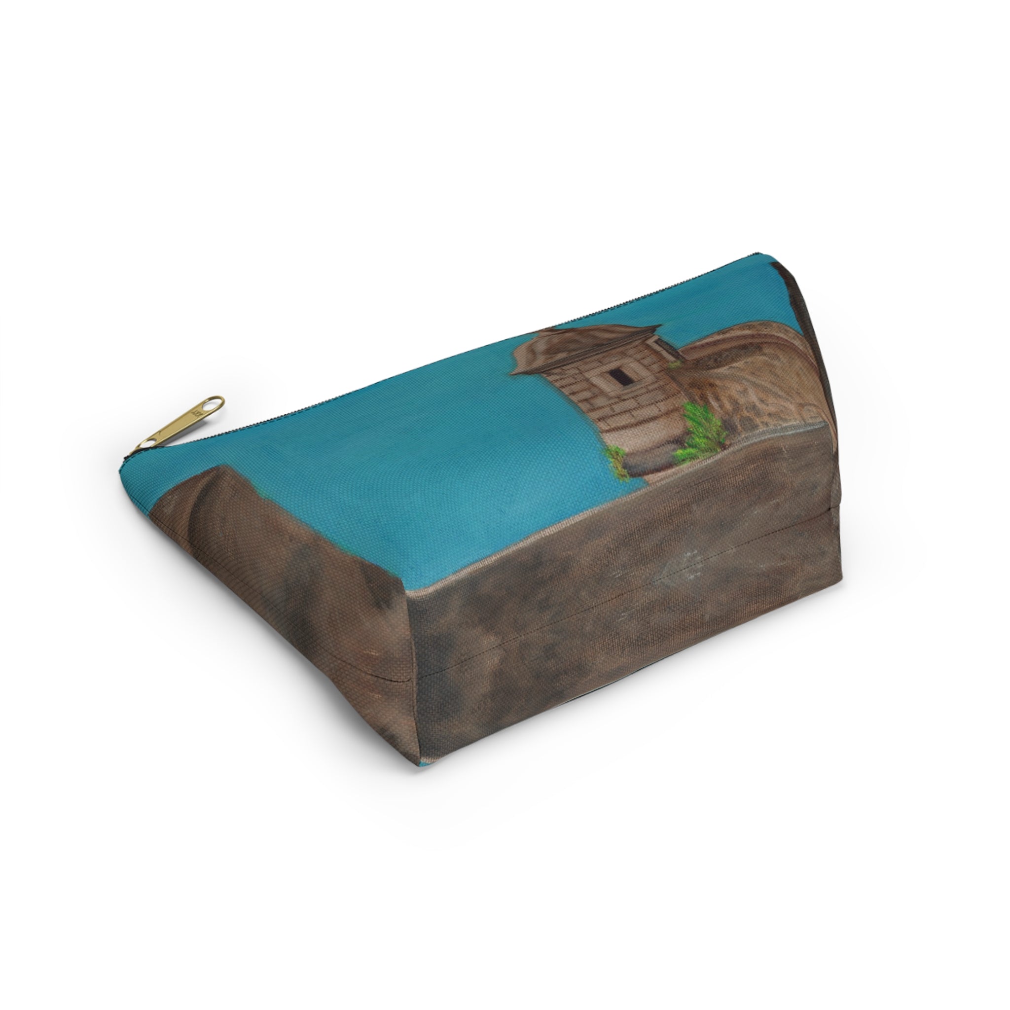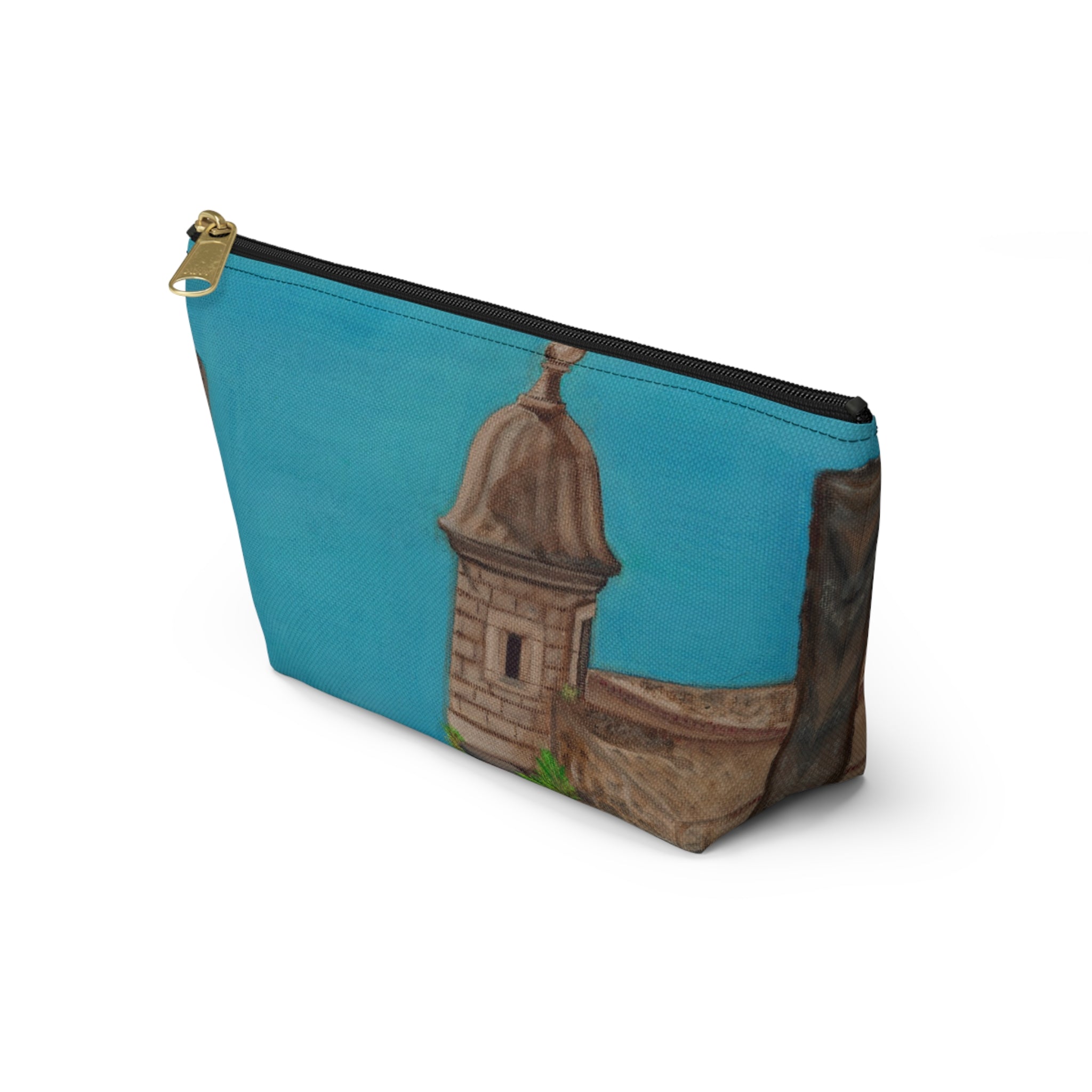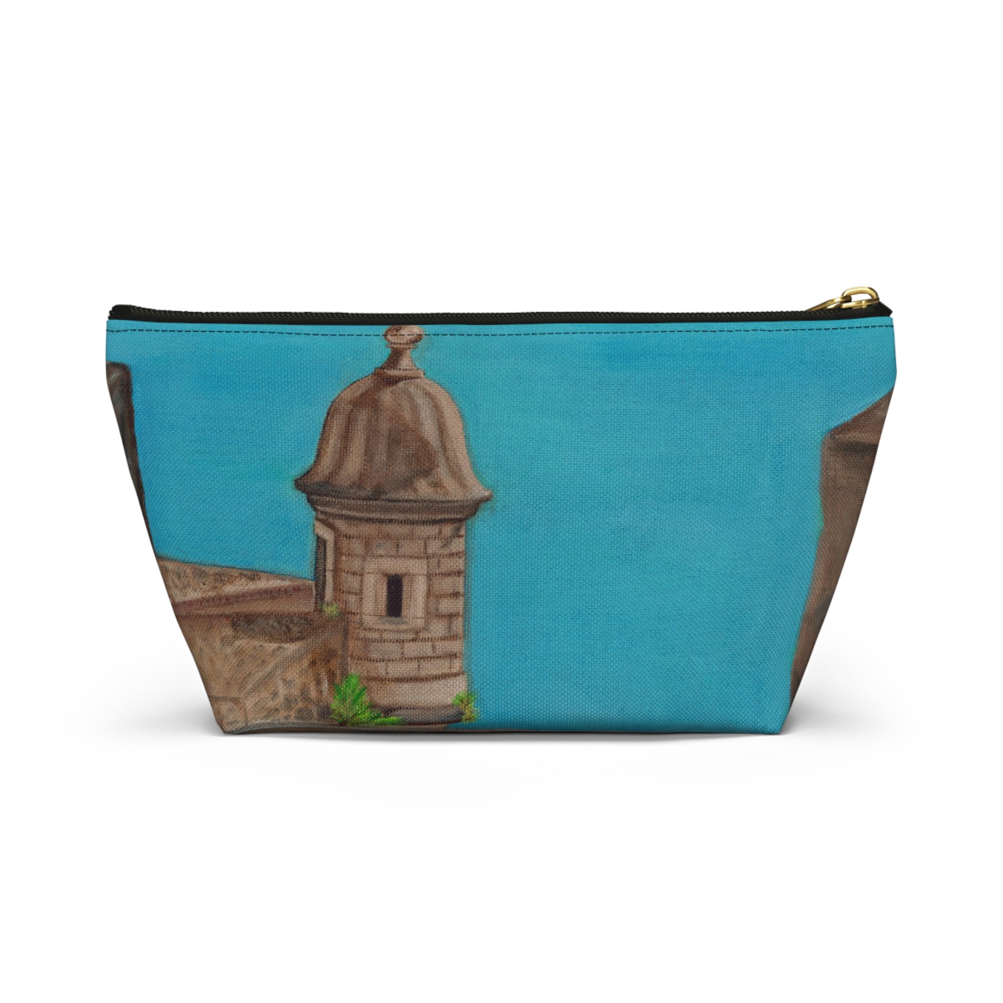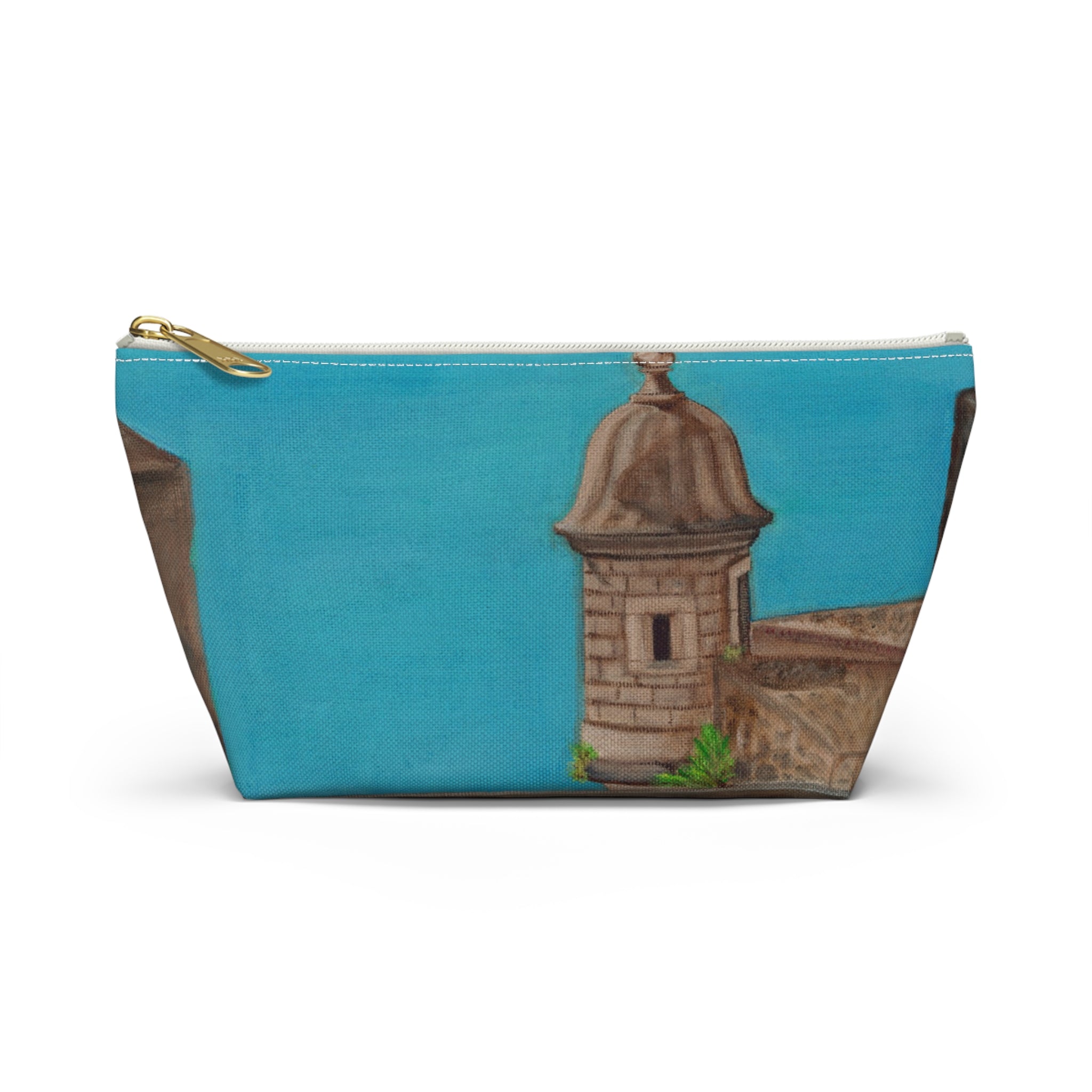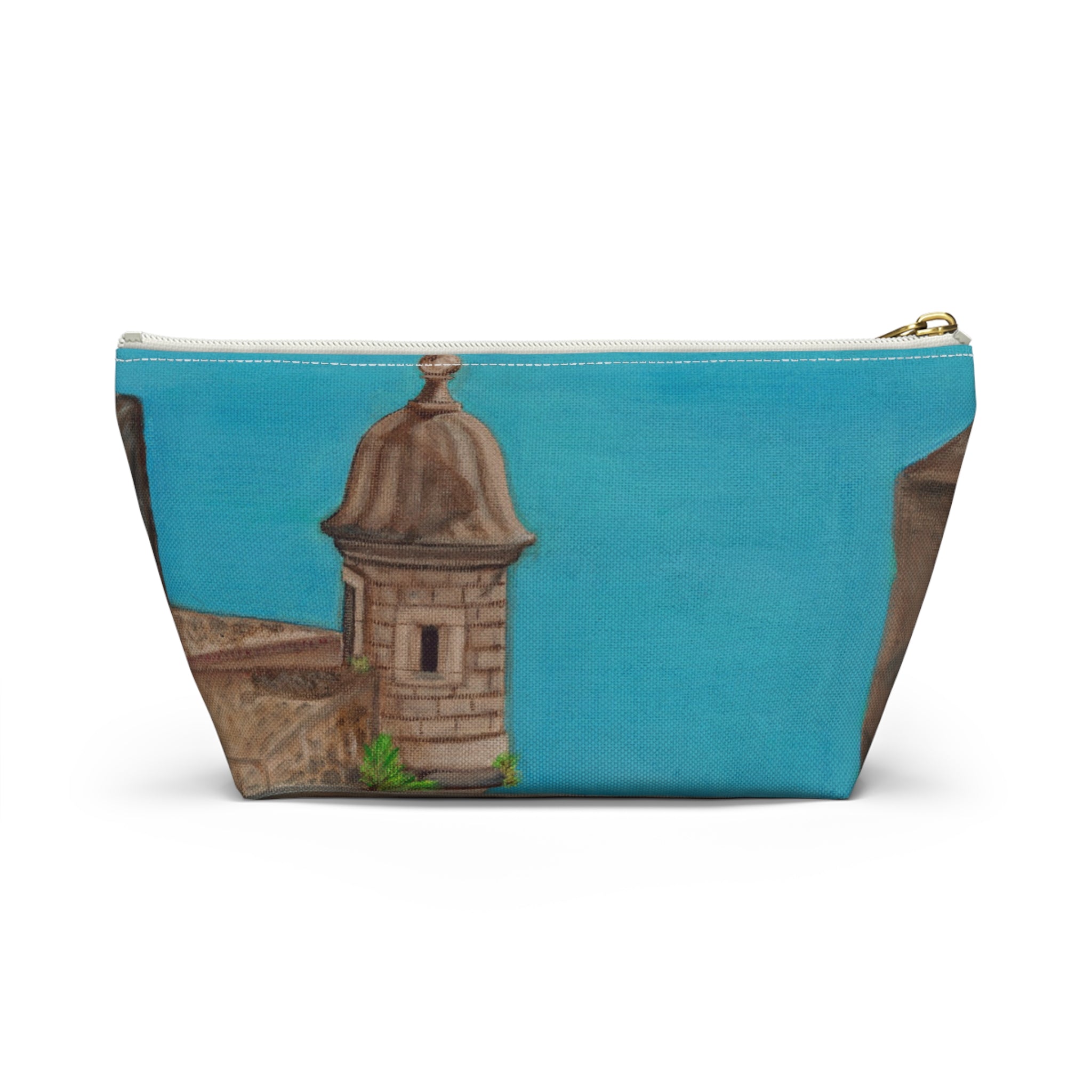 Accessory pouch that brings a touch of El Viejo San Juan to your daily routine. The wide T-bottom gives it a steady base so it sits open on your counter while you gather makeup, brushes, pens, or travel essentials. Lasting color on smooth polyester that resists wrinkles. Inside, a protective non-woven laminate keeps the shape and helps contain spills, while a durable zipper with a gold pull adds a little polish. Small enough to tuck into a tote but roomy enough for everyday carry, this pouch is made with care from globally sourced materials and assembled in the USA.